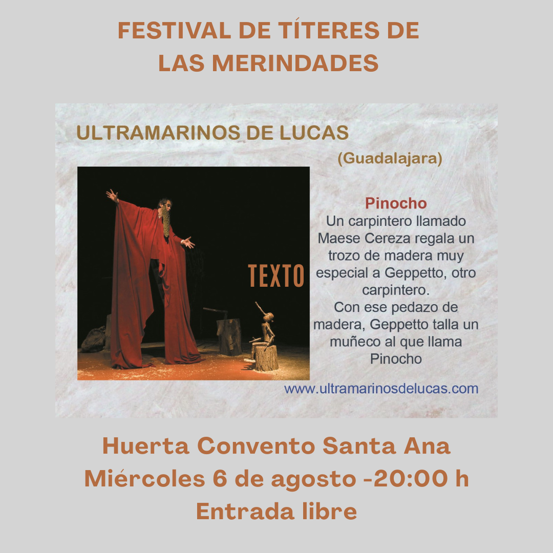 Espectáculo de títeres de manipulación directa basado en el célebre cuento de Carlo Collodi (1826-1890): Un carpintero llamado Maesse Cereza regala un trozo de madera muy especial a Geppetto, otro carpintero. Con ese pedazo de madera, Geppetto talla un muñeco al que llama Pinocho. Miércoles 6 de agosto 20:00 h Huerta del Convento Santa Ana Entrada libre