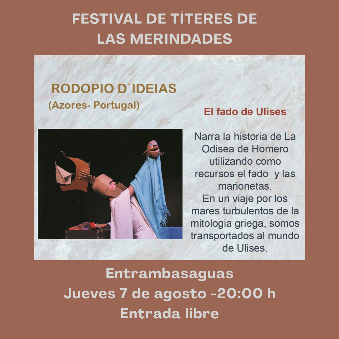 Narra la historia de ala Odisea de Homero utilizando como recursos el fado y las marionetas. Un espectáculo de títeres de mesa y música en directo con un viaje por los mares turbulentos de la mitología griega que nos transportará al mundo de Ulises. Jueves 7 de agosto 20:00 h Plaza Entrambasaguas Entrada libre