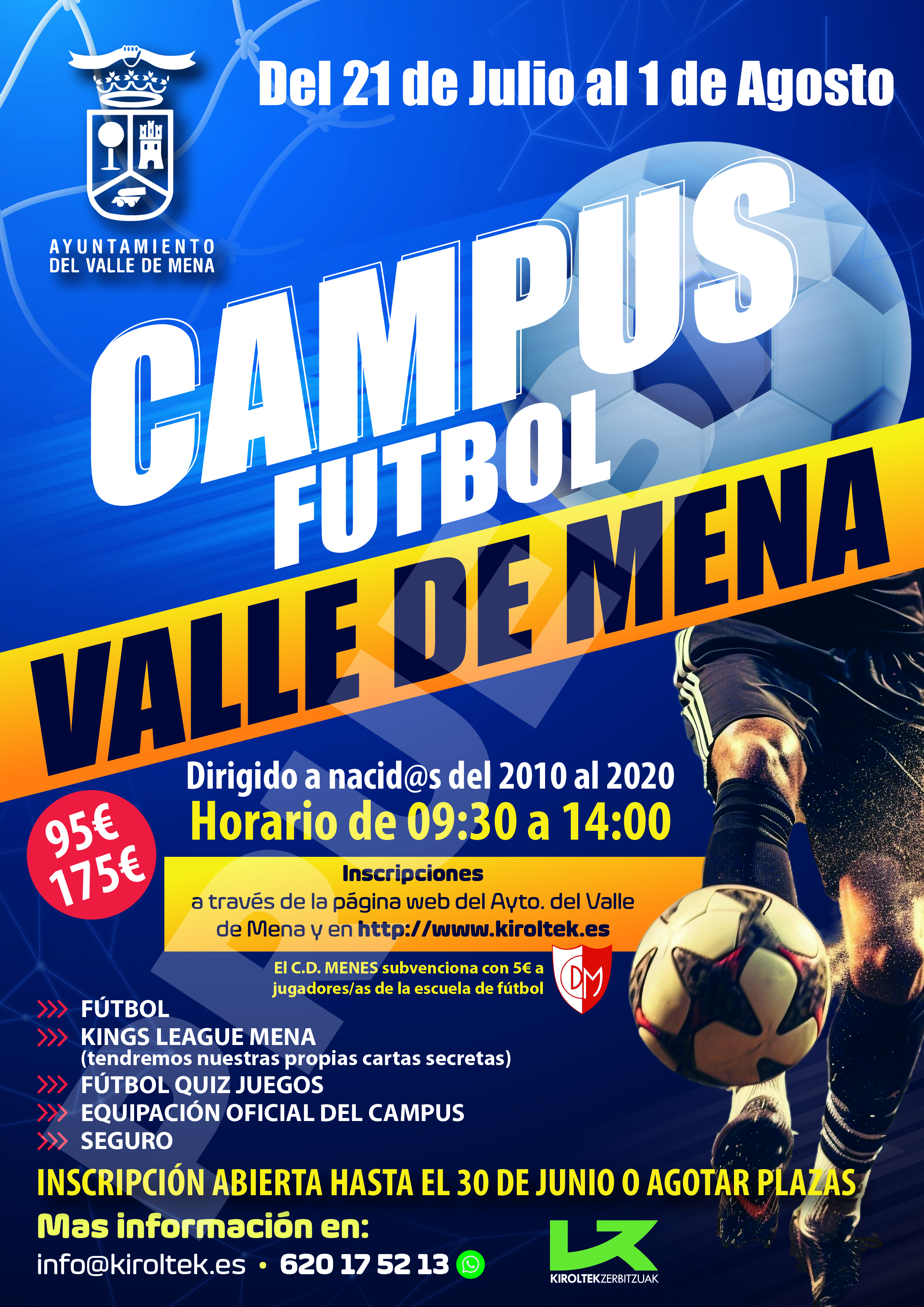 puedes participar en una o dos semanas, (consulta precios), nacid@s del 2010, al 2020. Inscripciones a través de la página web del Ayto. del Valle de Mena en: http://www.kiroltek.es. PARA MÁS INFORMACIÓN: 620175213, info@kiroltek.es. ¡ Plazas limitadas!.