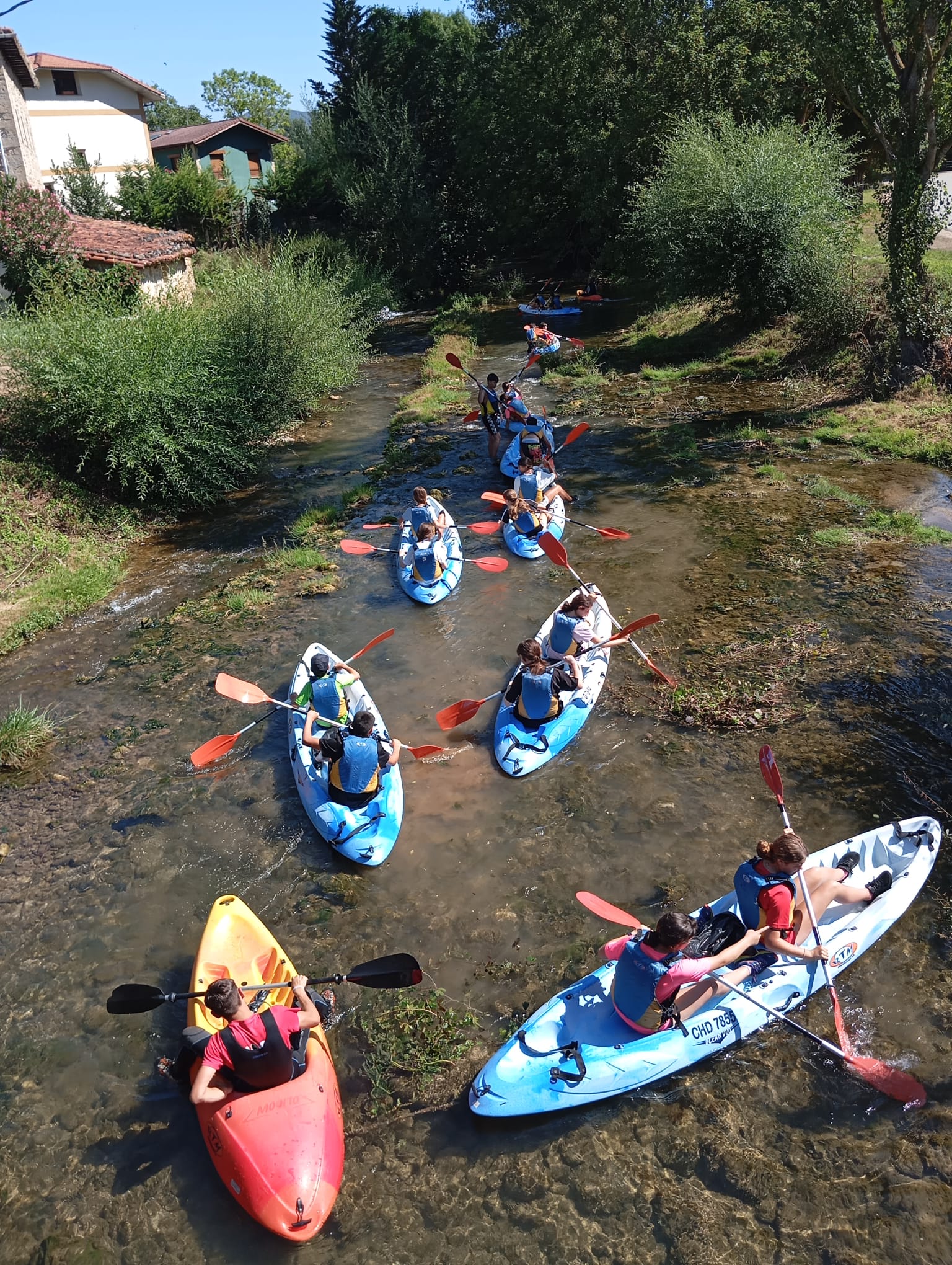 Los jóvenes del Valle de Mena, se mojan limpiando el río Cadagua a bordo de piraguas en el marco de la Expedición Cadagua 2025.